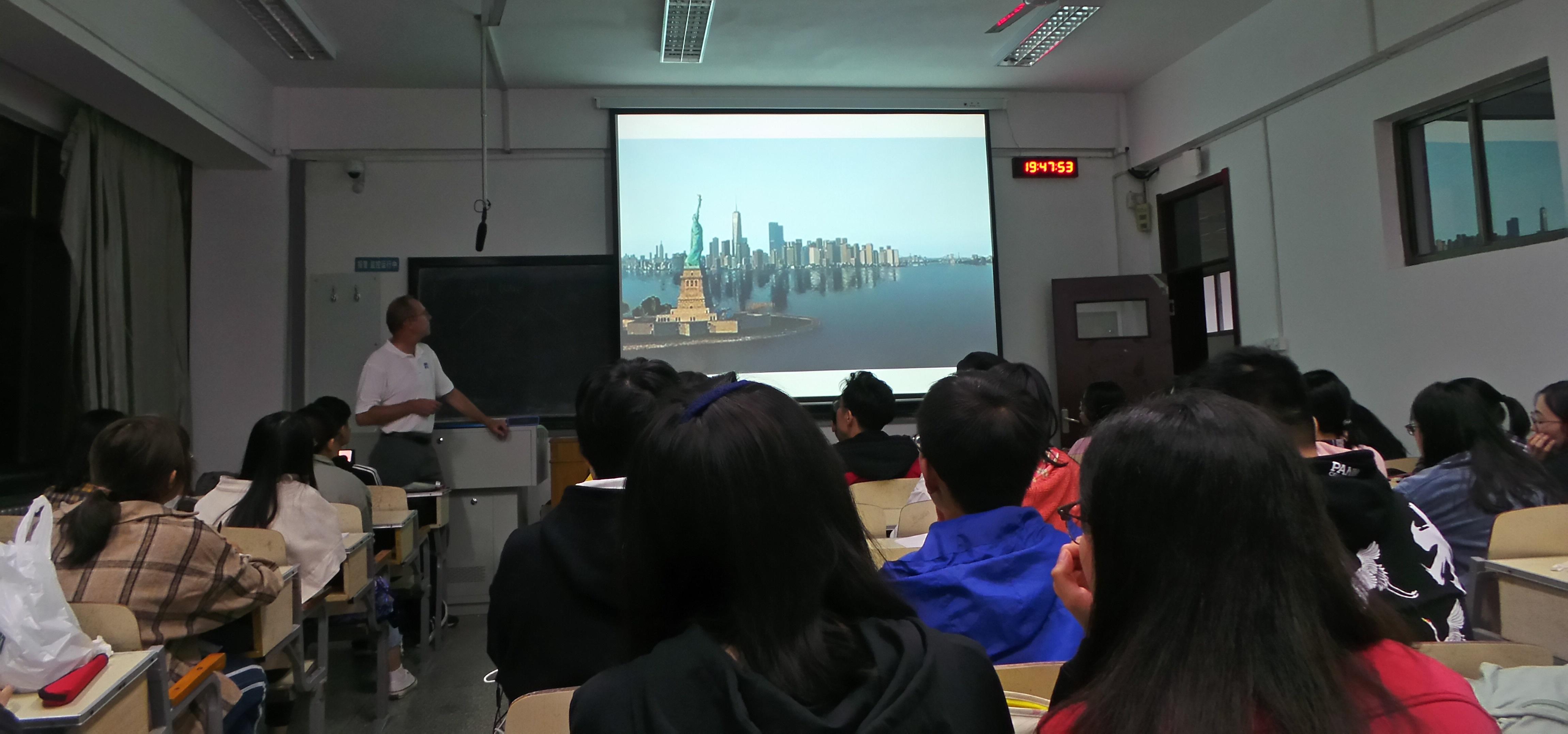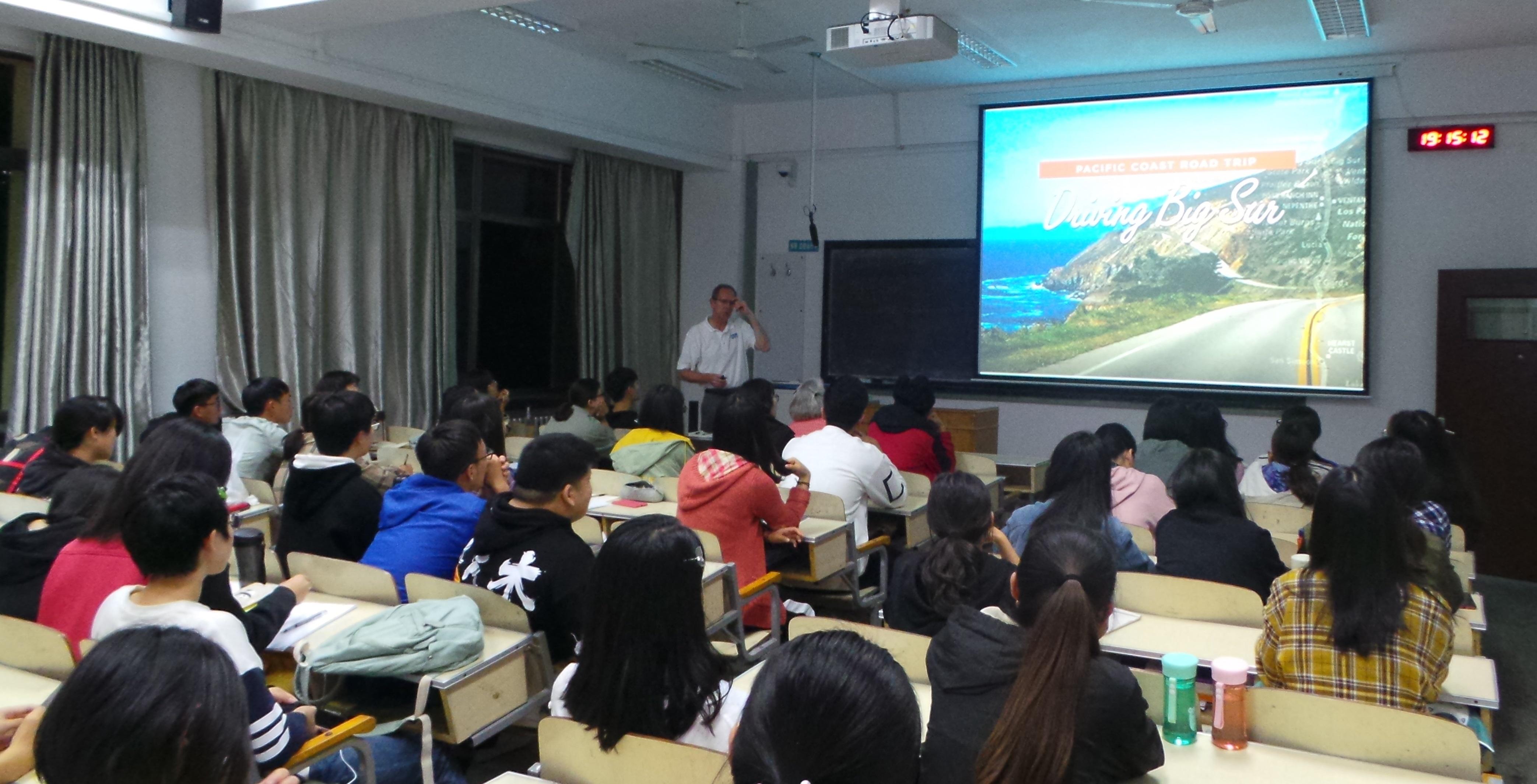 Sterling老师首先向大家分享了自己驾车沿太平洋海岸公路旅行的经历,然后通过几个妙趣横生的模仿表演和同学们展开互动,迅速调动起了同学们的参与热情。