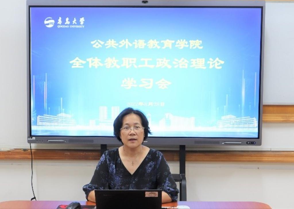 刘海荣带领大家集体学习了8月25日《习近平给外文出版社的外国专家的回信》,强调公共外语教师在教学工作中,要教育引导学生讲好中国故事,培养更多优秀外语人才,为促进中外文明交流互鉴,推动构建人类命运共同体做出贡献。