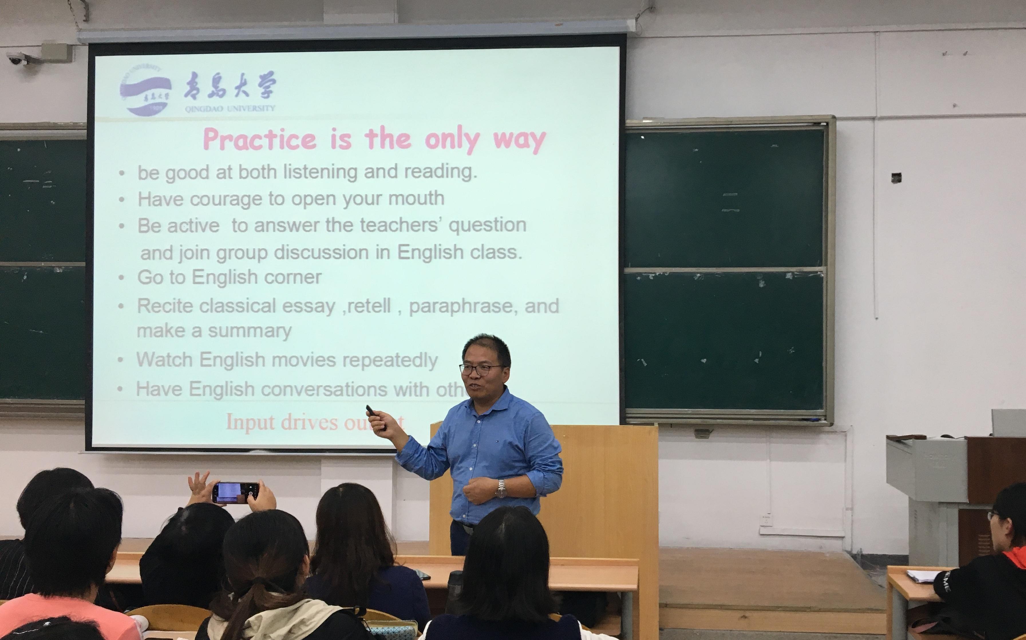 江美娜和于明杰老师的讲座聚焦大学英语听说这一难点。江美娜做了《如何提高听说能力》的讲座,通过对比高中英语与大学英语的异同,对听力和口语问题进行归因,进而提供解决对策和辅助学习APP;于明杰做了《输入与输出》的讲座,澄清了同学们在听说方面的困惑和误解,并就如何练习听力和口语尤其如何进行听力与口语的融合学习做了具体指导。