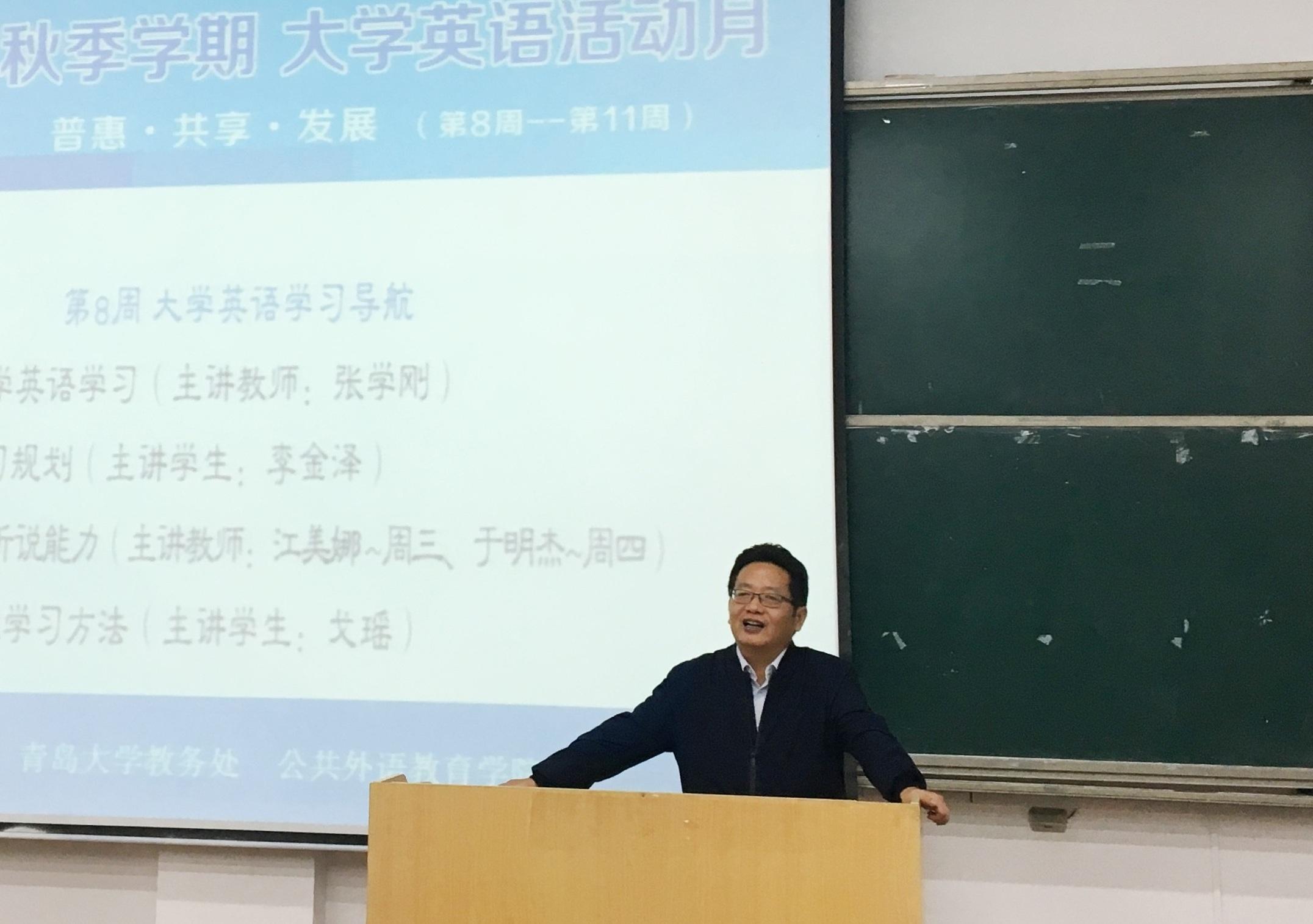 国林祥代表学院致辞,指出“大学英语活动月”是学院与教务处共同打造的特色校园文化品牌,活动主题定位于“普惠”师生、“共享”资源、共同“发展”。针对同学们的实际需求,活动月规划了大学英语学习导航、四六级和托福雅思备考指导等一系列专题讲座活动,由学院优秀教师和优秀学生代表联袂主讲。学院还开设丰富的英语拓展课程和选修课程,并常年开展“青大英语沙龙”、“大学英语精准教学服务”等特色教学活动,希望同学们充分利用学习资源,努力成才。