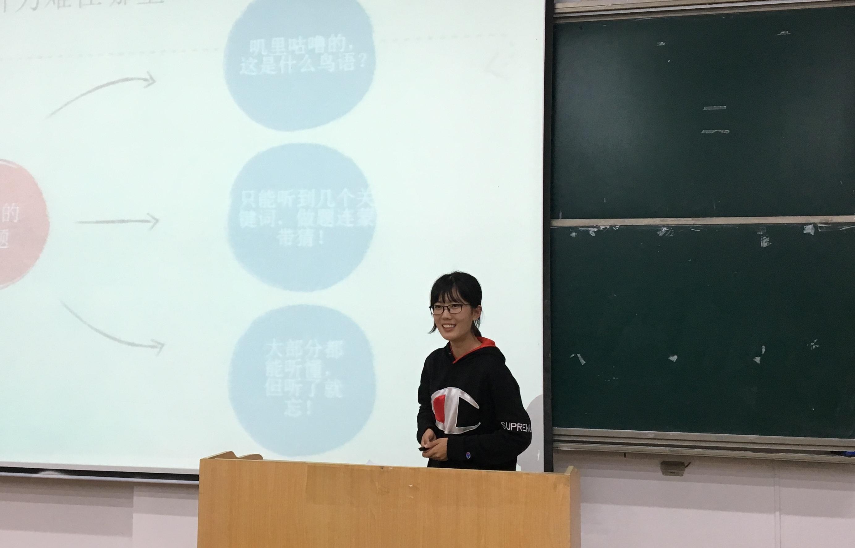 最后,来自医学部18级临床医学五年制专业的戈瑶同学做了《如何反杀英语听力和口语》的讲座,用风趣幽默的语言与大家分享了她的“三步听力练习法”以及多模仿、多说、勇敢开口的口语练习经验,并推荐了听说练习APP。
