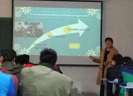 梁向真老师和张晶老师分别在浮山校区的博文楼404和博学楼208进行了示范课的展示,两位老师主讲的课程都是针对16级学生的新编大学英语第三册第六单元Man and Animals,虽然教学内容一致,但两位老师各有风格,梁老师侧重讲述人和动物的关系,通过讲解人和动物共同的好斗性介绍了对比和对照的写作模式。张老师则是通过课前背景知识的巧妙引入进而导入到课文第一篇阅读的分析。来自全国十几所院校的20多位老师在交流中对梁向真老师精心的课程设计,写作模式的操练以及张晶老师纯正的发音,设计独特的引入赞不绝口。