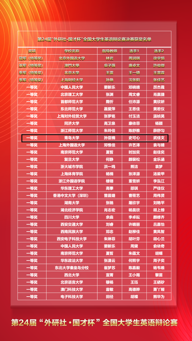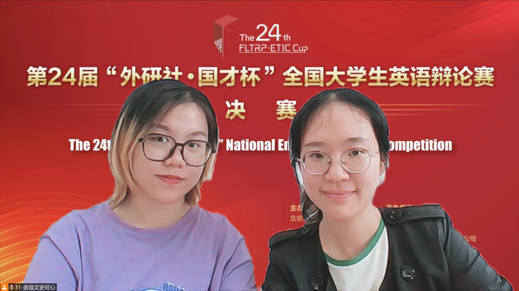 2022年6月13日,第24届“外研社·国才杯”全国大学生英语辩论赛落下帷幕。我校史可心(医学部研究生)、武佳文(数学与统计学院大四学生)组成的辩论队在指导教师孙亚楠(黑料不打烊