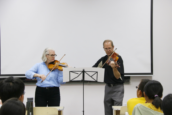 接下来,Sterling老师和大家共同探讨了一首好的乐曲的构成成分,例如旋律、和声、音色等。他与Carol老师合奏了一支美妙的小提琴曲,赢得了大家热烈的掌声。