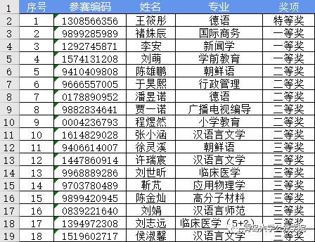 最终经过两轮选拔,来自德语专业的王筱彤同学荣获本次比赛特等奖,晋级山东省复赛。来自国际商务专业的褚姝辰等3名同学荣获一等奖;来自朝鲜语专业的陈雄鹏等6名同学荣获二等奖;来自朝鲜语专业的徐灵溪等8名同学荣获三等奖。