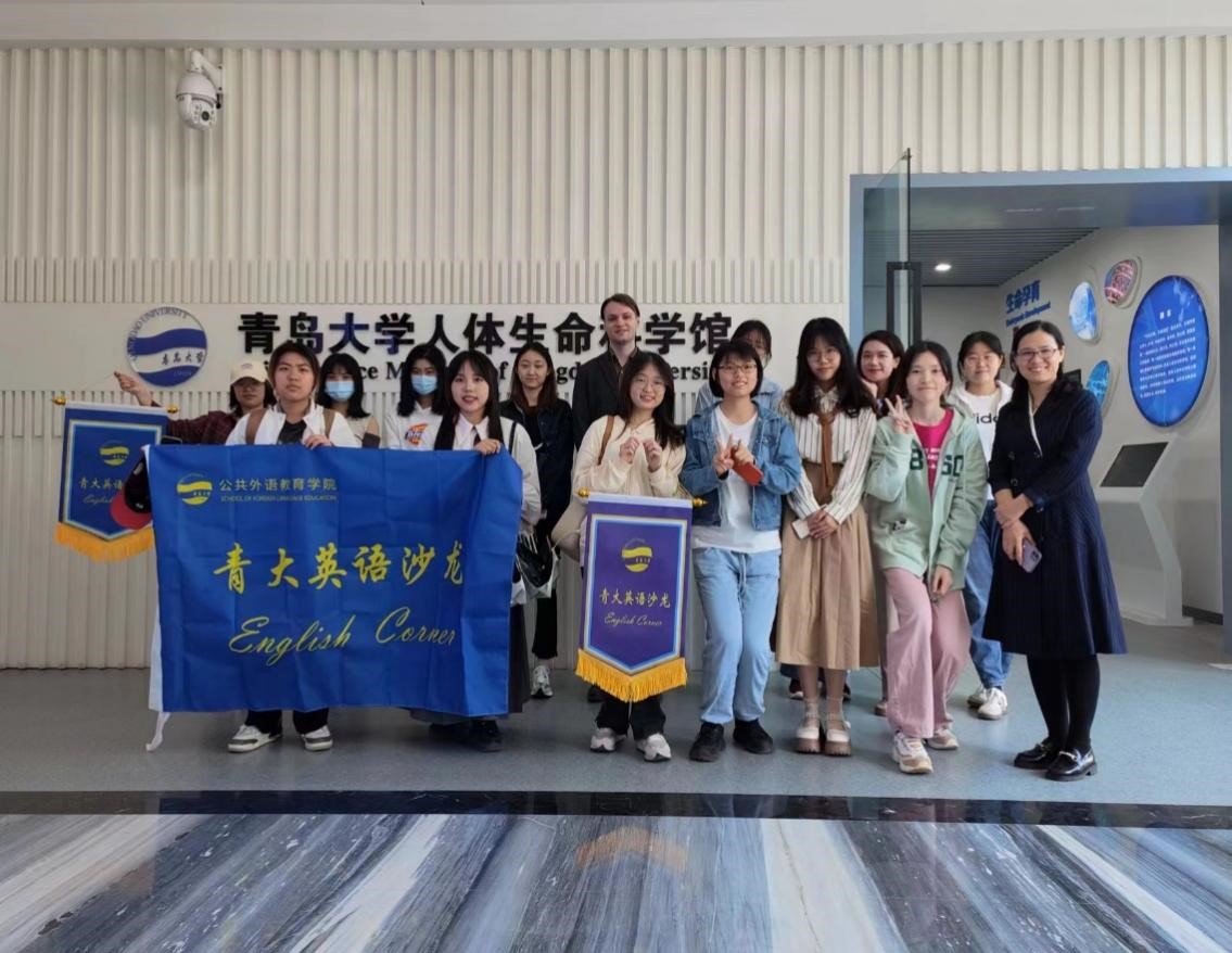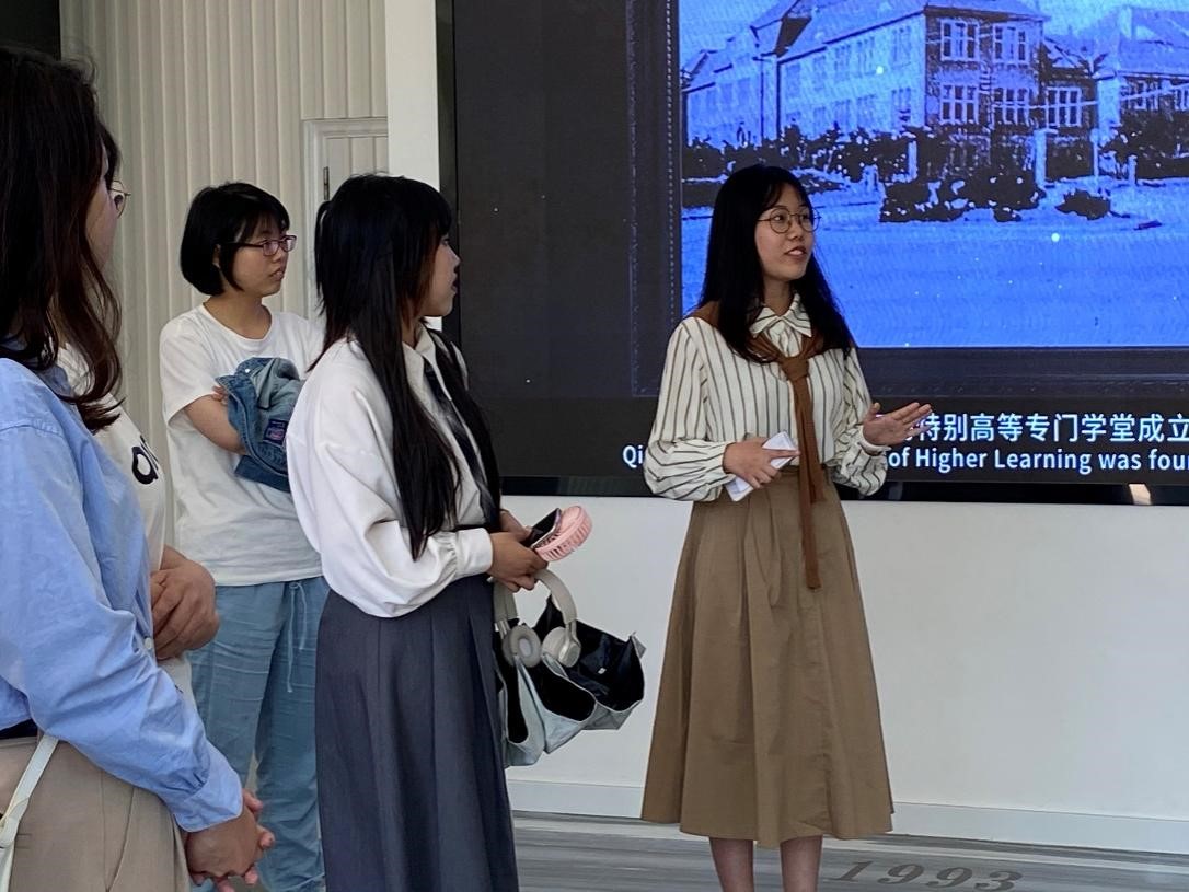 在青医之魂沈福彭教授生平事迹展区,大家听刘萌同学用英语讲述一代良师的敬业事迹,大家被沈教授的高尚品德和奉献精神深深地打动,纷纷表示要以沈教授这样的大先生为楷模,努力奋发,乐于奉献,争做优秀的新时代大学生。