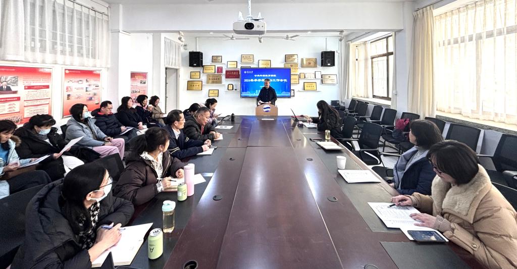 在睿思楼202会议室召开2024春季学期期初工作会议暨教职工政治理论学习会。院长国林祥主持会议,副院长王海峻、印玲,各教研室主任及教师代表现场参会。
