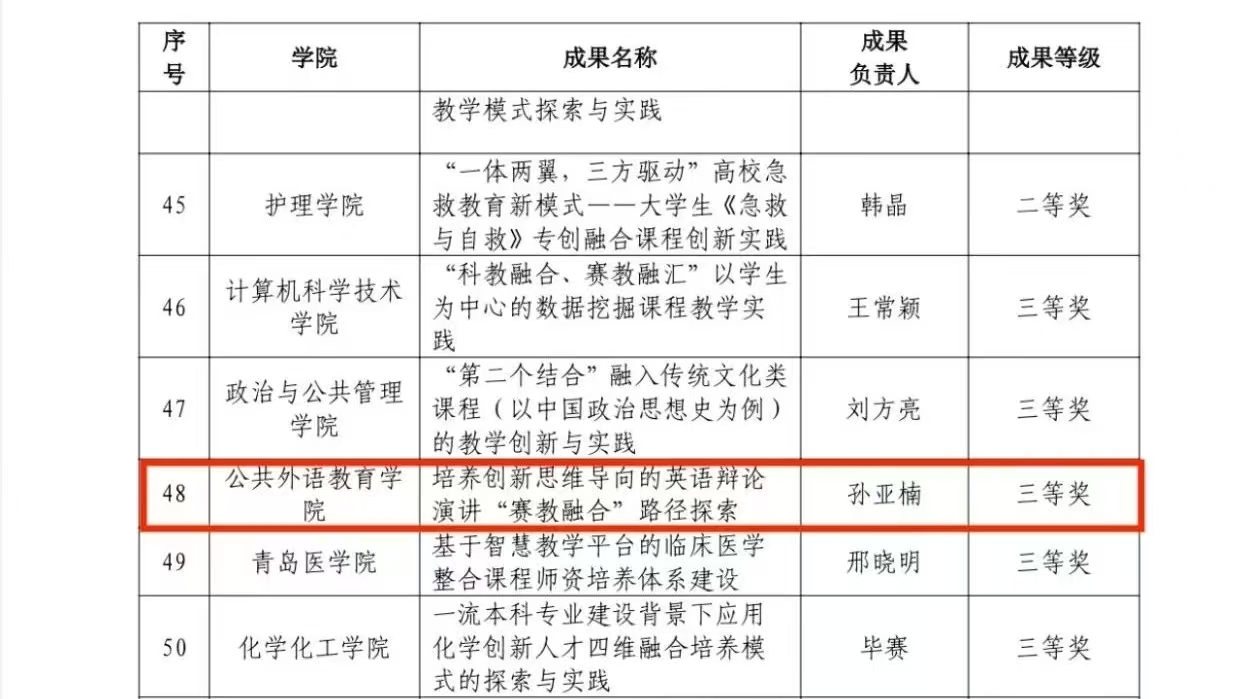教师孙亚楠申报的“培养创新思维导向的英语辩论演讲‘赛教融合’路径探索”荣获三等奖。