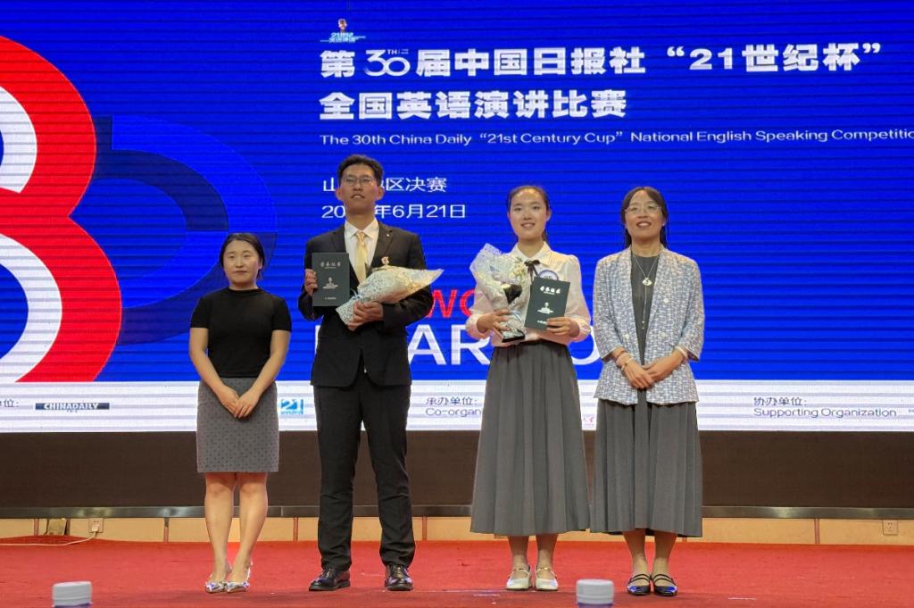 比赛中,来自山东省内各高校的43名选手同台竞技,各展其才,围绕“Living within and beyond the 21st century”这一主题,用流利的英语表达了对时代发展的独特见解,展现出当代青年对未来的无限憧憬与探索精神。我校选派的高晨峻、杨思齐两位同学顺利完成已备演讲、即兴演讲、现场答问三个环节,以扎实的英文功底、敏捷的英语思辨、富有激情的表达获得大赛评委认可,展示了青大学子的优秀风采,最终分别获得本次大赛的亚军和三等奖。高晨峻同学将代表我省参加全国半决赛。
