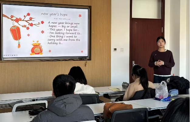 本次活动由志愿者协会学习部部长王紫怡主持,活动围绕“New Year Vibes——Stories and reflections on the holiday”展开。在场师生分享了自己对春节的感受以及春节里的风俗习惯。活动伊始,主持人邀请大家走上舞台,分享自己在春节期间拍摄的珍贵快照,用一张张照片串联起温暖的节日瞬间。分享者们用英语讲述照片背后的故事,让在场师生沉浸式感受中国春节的烟火气息。