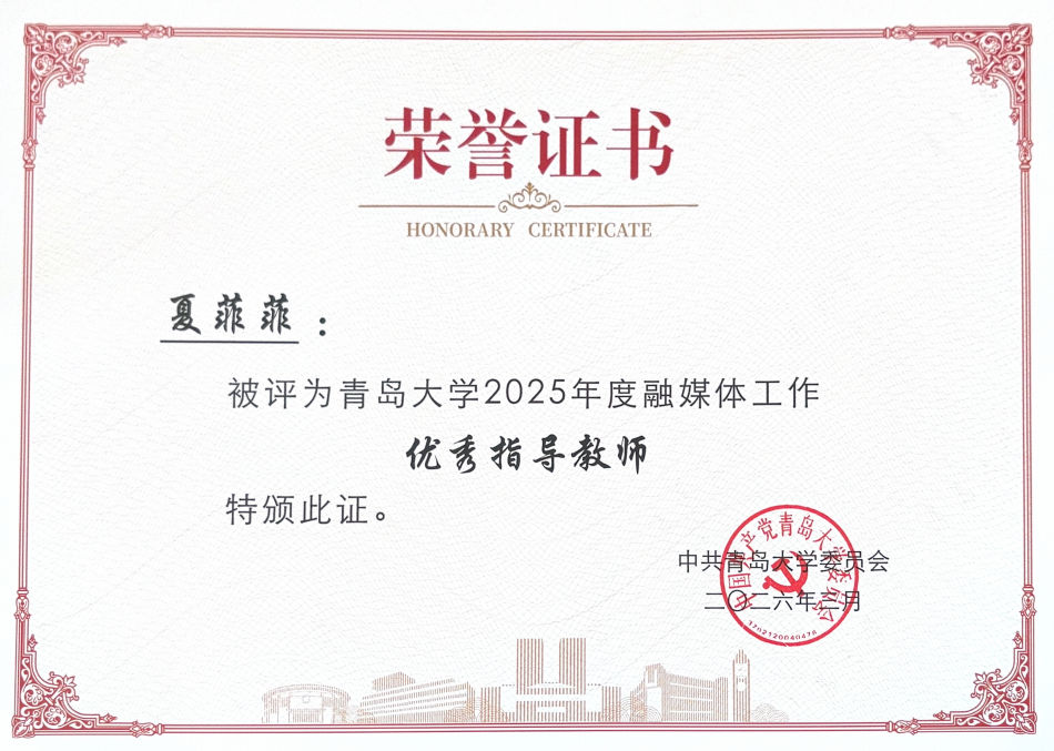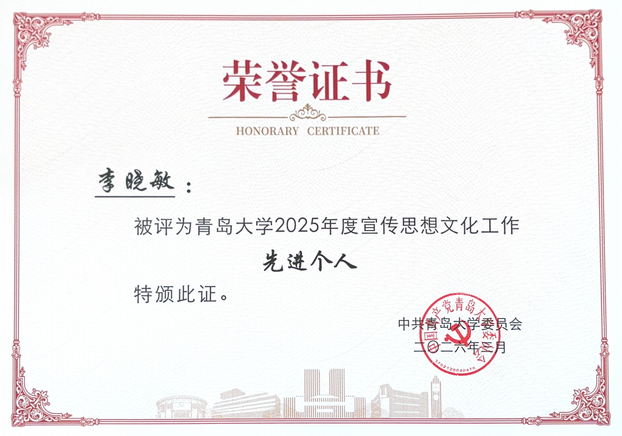 公布2025年度宣传思想文化工作表彰结果,学院集体与个人荣获多项荣誉。其中,学院党委获评“政治理论学习先进基层党委”,李晓敏老师获评“宣传思想文化工作先进个人”,夏菲菲老师获评“融媒体工作优秀指导教师”。