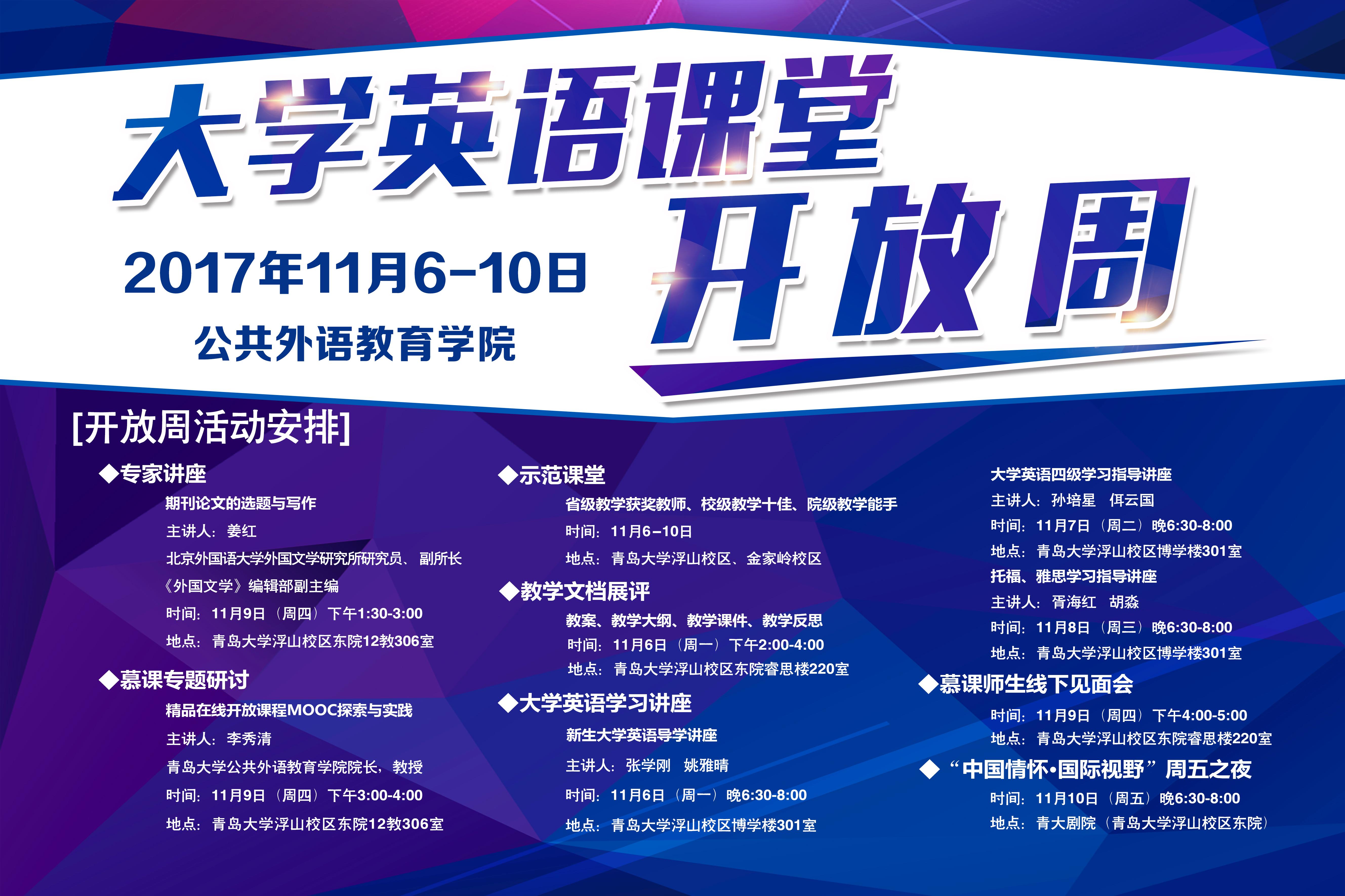 定于2017年11月6-10日举办“大学英语课堂开放周”活动,旨在促进大学英语教学和研究,建设高效课堂,增进大学英语教学改革经验共享和交流。