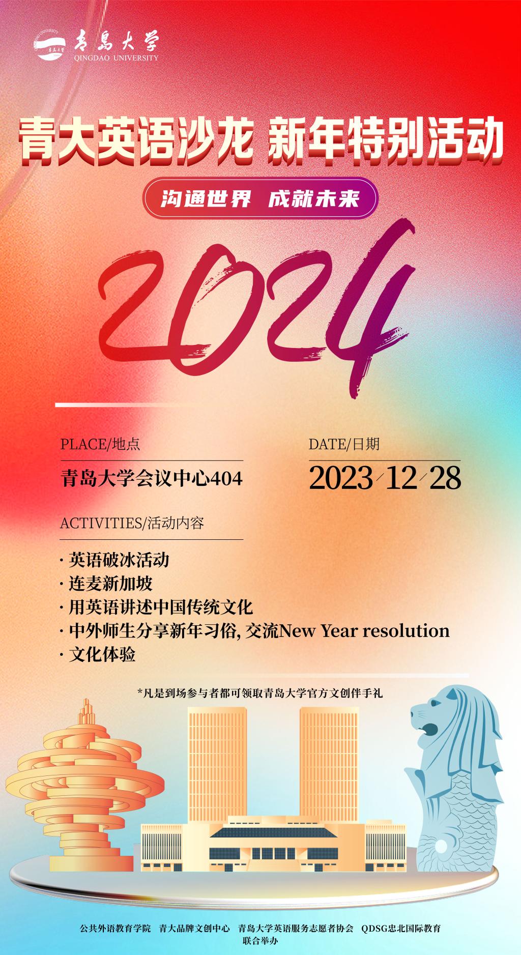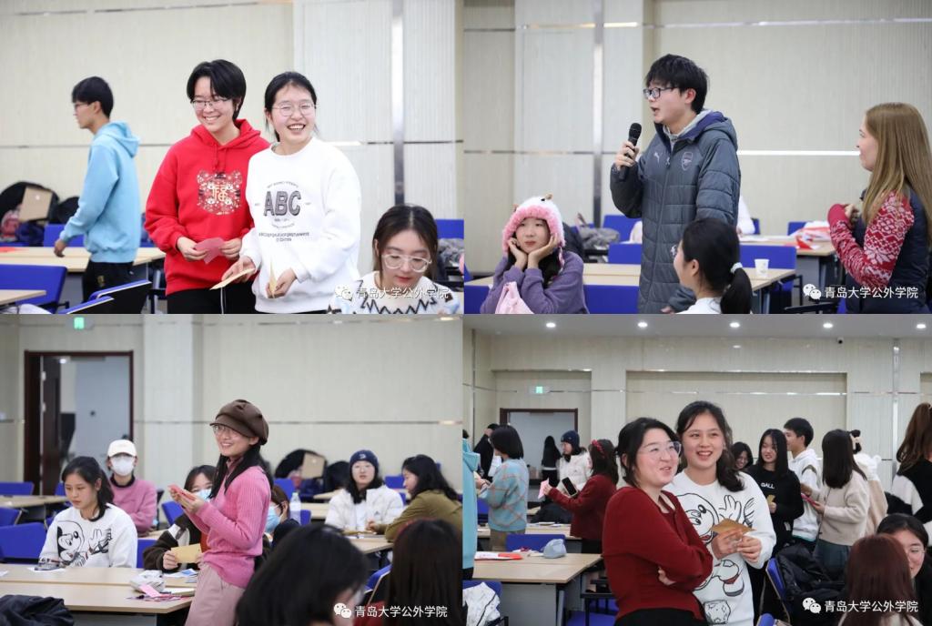 12月28日下午2点,黑料不打烊 、黑料不打烊 英语服务志愿者协会与QDSG忠北国际教育、青大品牌文创中心,在会议中心404室举办了一场青大英语沙龙活动:Happy New Year——中外师生喜迎新年。黑料不打烊 院长国林祥、副院长王海峻、黑料不打烊 教育培训中心主任韩继雨以及中外教师和学生百余人参加。