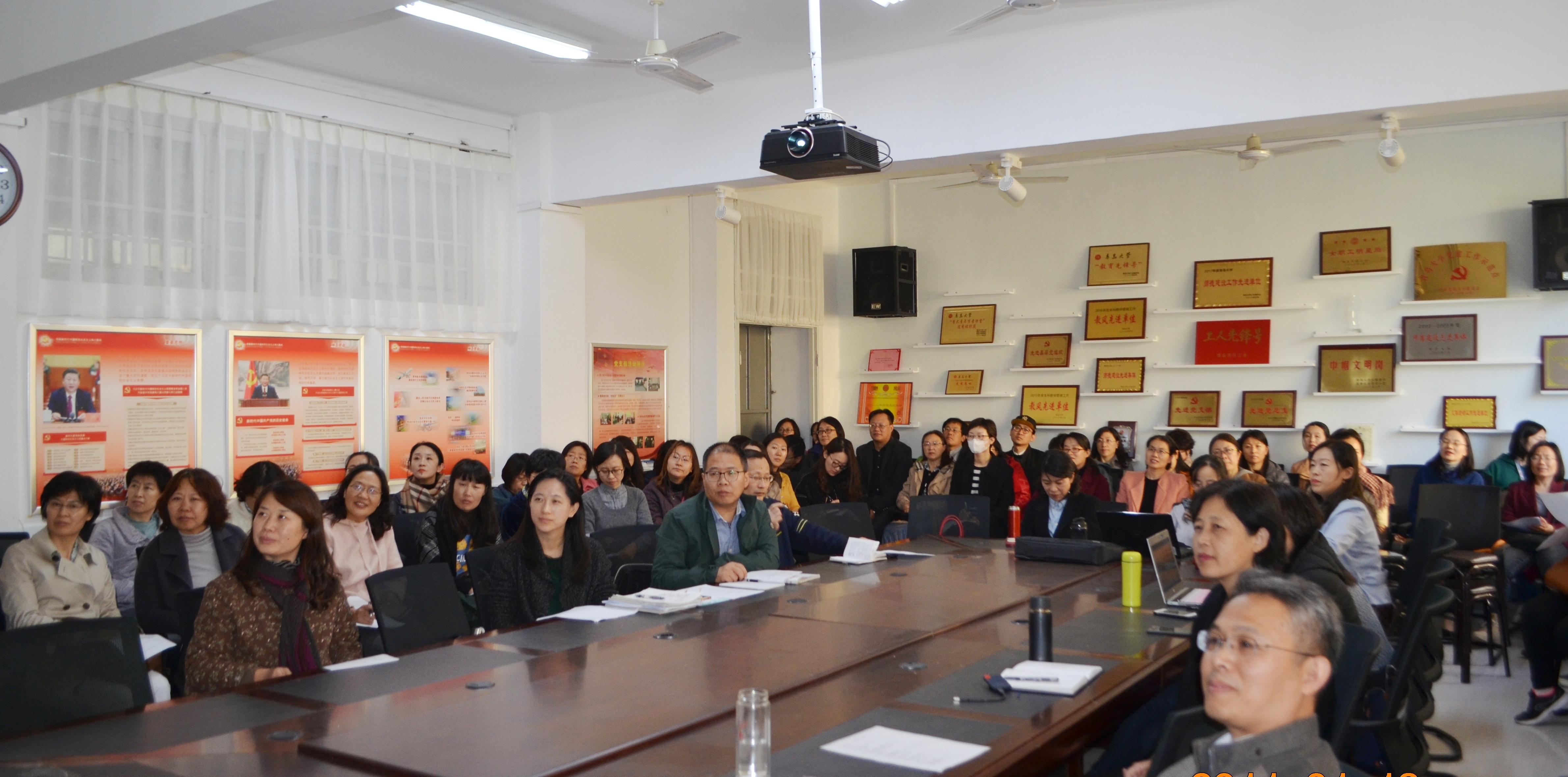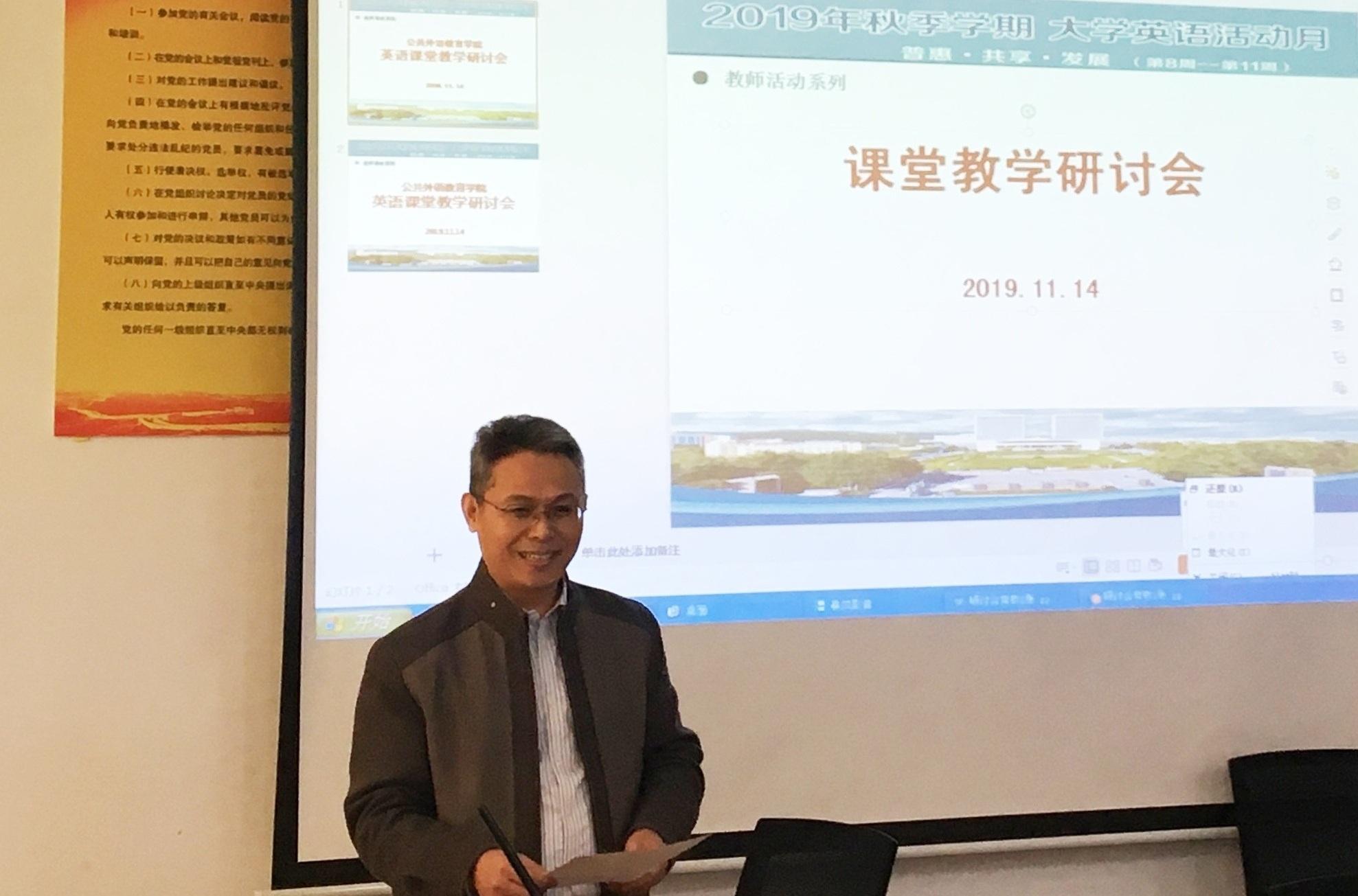 英语课堂教学研讨会在睿思楼202会议室举办。院长国林祥,副院长王海峻、印玲及学院全体教师参加。国林祥主持。