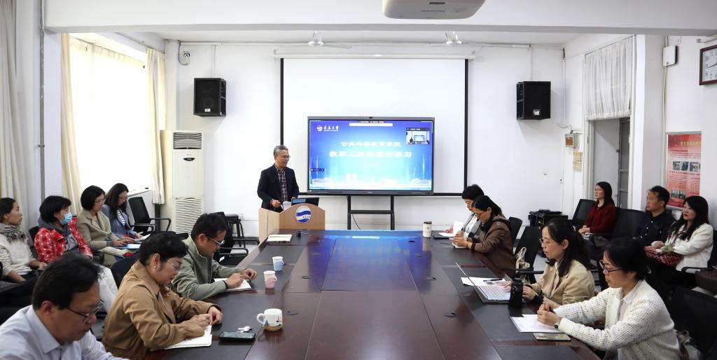 在睿思楼202会议室召开全体教职工政治理论学习会暨大学英语活动月教师研修分享会。校党委第二巡察组副组长孙鹏、成员沈香韫莅临督导,学院班子成员及全体教师参会。学院党委副书记、院长国林祥主持会议。