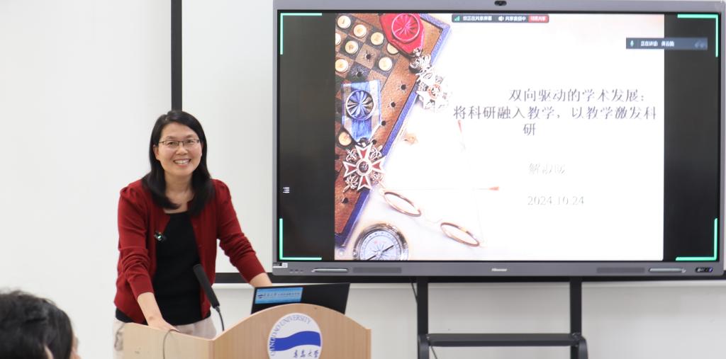 党员骨干教师解淑暖结合研究生学术英语教学与研究经历和暑期参加的外研社全国高校外语教学研究与教师发展研修班的心得,作了题为《双向驱动的学术发展:将科研融入教学,以教学激发科研》的讲座,分享了高校外语教师在新时代高校外语教育的新形势新要求下,如何昂扬“敢为”之志、锻造“善为”之能、提升“有为”之效。