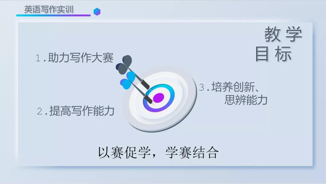 英语写作实训是针对“外研社杯”全国英语写作大赛专门设置的写作实践提升课程,吸收成绩优异学生,进行英语写作技能与写作大赛赛题解析以及应赛策略相结合的实训,培养学生英语思维及创新、思辨能力,切实提高学生英语写作水平,助力学生参加英语写作大赛取得优异成绩,并为其未来更高层次学业及职业发展打下坚实语言基础。